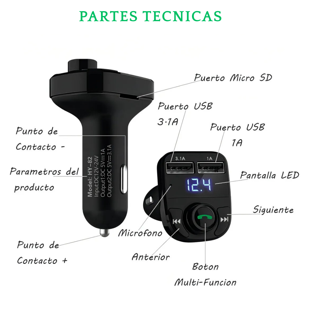 📱 Este pequeño dispositivo te permite conectar tu celular al carro vía Bluetooth, 🎶 escuchar tu música favorita, 📞 contestar llamadas sin soltar el volante y ⚡ cargar 2 dispositivos al mismo tiempo.